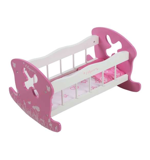 Cuna - cama con balancín realizada en madera de color blanco y rosa. Incluye ropa de cama para dormir a su muñeco. Medidas 49.5x39.5x29.5cm. Edad indicada +3 años.