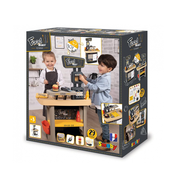 El restaurante Food Corner es una cocina y un restaurante para niños todo en uno. Parte frontal con zona de clientes con el menú, el terminal de pedidos, el dispensador de bebidas y una bandeja de salida y retorno para pedir. Parte trasera con una completa cocina infantil para preparar los platos que se pidan. Con fogones, freidora, una cafetera, un horno y un frigorífico. 29 accesorios en total. Dimensiones montado: 63 x 38,8 x 95,5 cm.