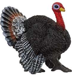 Los pavos pertenecen a la familia de los faisánidos y son originarios de Norteamérica. Los machos cuentan con un plumaje de color negro en el que se intercalan plumas de colores metálicos brillantes. Tanto el cuello como la cabeza carecen de plumaje y presentan un color rojizo intenso y azul claro. Cuando los machos cortejan a las hembras para el apareamiento, despliegan en forma de abanico el plumaje de la cola, tal y como lo hace el pavo de Schleich® Farm World. +3