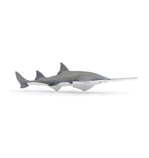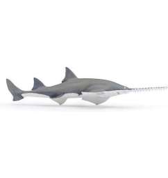 FIGURA PEZ SIERRA ( PAPO ) El pez sierra peine (Pristis pectinata) es una especie de pez perteneciente a la familia Pristidae (pez sierra). El macho puede alcanzar una longitud máxima de 640 cm, a pesar de que la media es de 550 cm. Presenta un cuerpo aplanado y aletas pectorales en forma de alas. La boca está situada lateralmente y los ojos dorsalmente. Es ovovivíparo y las hembras pueden tener camadas de 15-20 individuos, los cuales miden 60 cm en el momento de nacer. También se reproduce por clonación de las hembras sin fertilización del macho