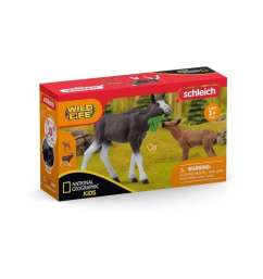 El Alce hembra tiene un largo hocico con el que huele la sabrosa hierba. El manojo de hierba que tiene a sus pies está tan rico que aún comería más. A su pequeña cría aún no le interesa la hierba. ¡Prefiere beber la leche de su madre, que está riquísima!