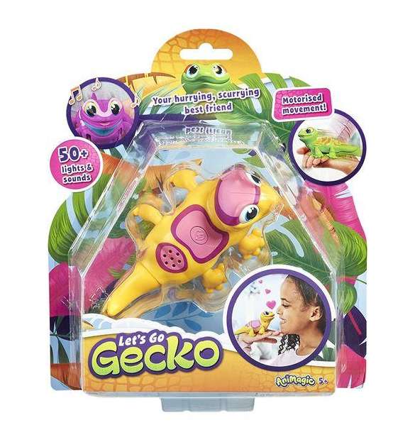 Puede andar y bailar en la mesa, cama. pero su sitio preferido es la palma de tu mano. Además de sus 2 modos de caminar, lento o rápido, tiene un modo baile, con movimiento completo, luces y sonidos. Y para que sepas cómo se siente, sus ojos se iluminan de 5 colores diferentes para mostrarte qué le pasa. Más de 50 efectos de sonido diferentes. Con sensores que hacen que Gecko reaccione al tacto.