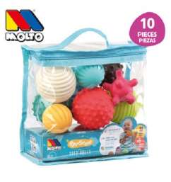 Bolsa con 10 bolas sensoriales de diferentes colores, tamaños, formas y tactos para bebés que son suaves, blanditas y fáciles de agarrar.