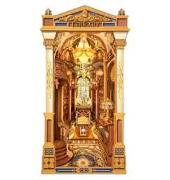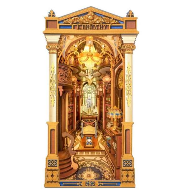 Cruza el majestuoso arco de la Library of Wonders y adéntrate en un archivo digno de los dioses. Este diorama decorativo captura la esencia de las grandes bibliotecas gótico-victorianas, donde el conocimiento se custodia entre columnas romanas y techos abovedados con intrincadas filigranas doradas. Al encender su iluminación LED, el espacio cobra una dimensión mágica: un elegante candelabro y varios faroles de pared resaltan las filas de libros antiguos y los artefactos históricos que descansan en sus estanterías de tono caoba.