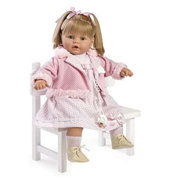 Muñeca baby dulzona de 62 cm vestida con traje y chaqueta rosa. El cuerpo es blandito y al pulsar su barriguita llora. Edad recomendada +3 años. Silla de la imagen no incluída. Pilas incluídas.