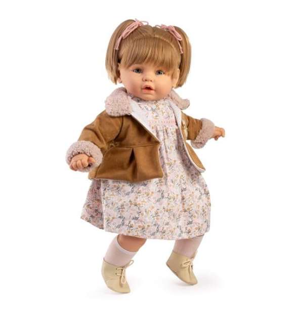 Vestimenta: Incluye un vestido con estampado floral y una chaqueta de pelo sintético en color marrón.