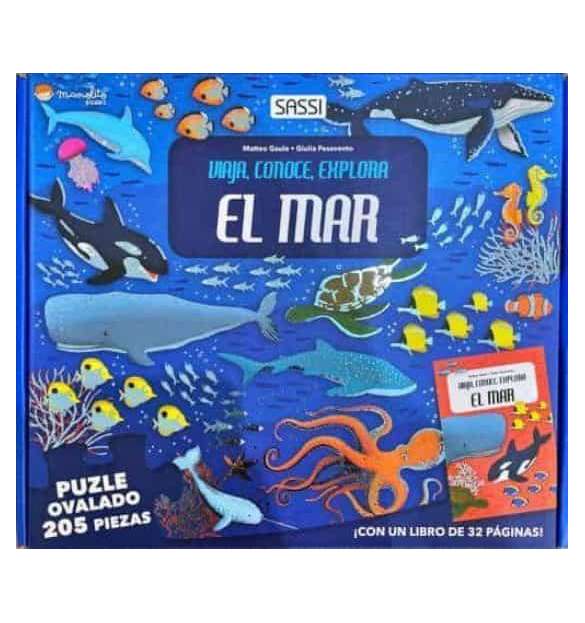 El maletín contiene un libro sobre el mar de 32 páginas y un puzzle ovalado de 205 piezas y 98x67 cm.
