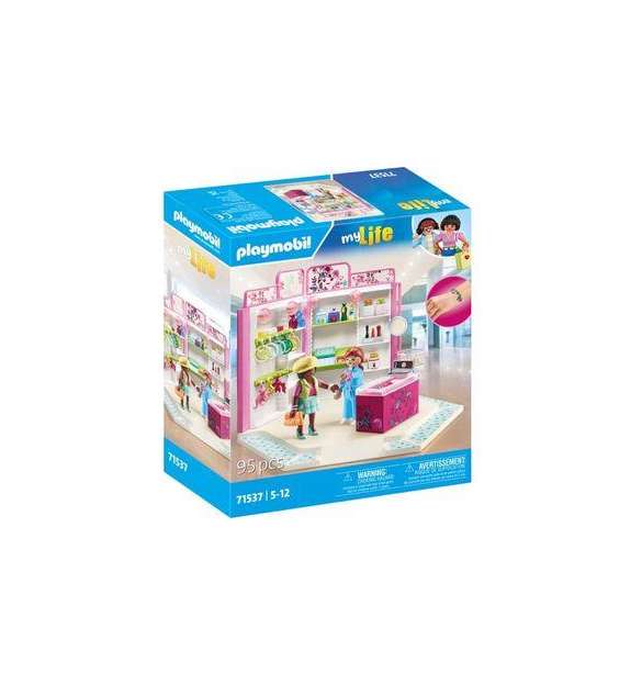 Tienda con dos figuras PLAYMOBIL, vitrina, cajas, pulseras, estrellas de flores, lápiz labial y muchos otros accesorios de maquillaje y joyería.