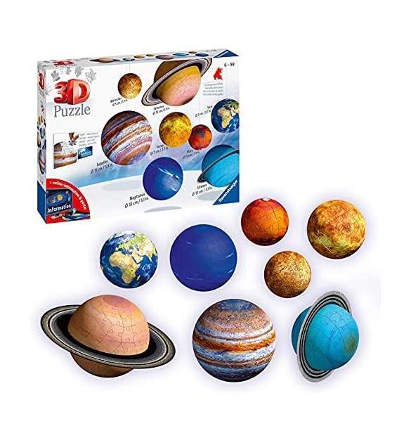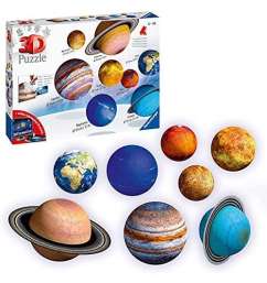 Una hermosa reproducción en 3D del sistema planetrio! 8 puzzleballs de los planetas del sistema solar en 522 piezas. Descubre el puzzle en una nueva dimensión. Los puzzles 3D Ravensburger te muestran un nuevo camino para la diversión. ¡Completa la obra con los numerosos accesorios incluidos en el paquete y decora tu habitación aprendendo la astronomía! Dimensiones caja: 31x 22x7 cm. Dimensiones finales: 30x14x15 cm.